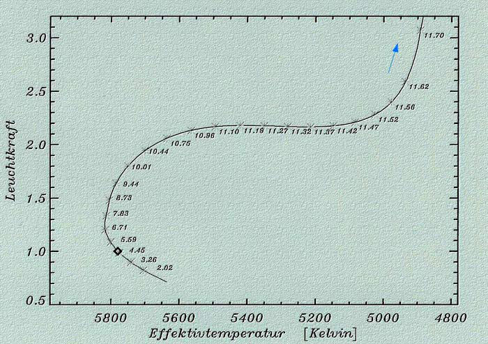 Abbildung 2: Entwicklungsweg-Diagramm der Sonne. Im Gegensatz zu der entsprechenden Abbildung 1